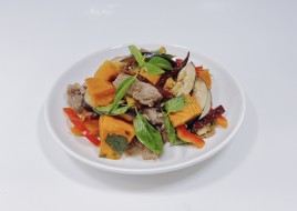 Red chili paste with coconut milk, pumpkin, carrot, basil, bell peppers, and green beans.